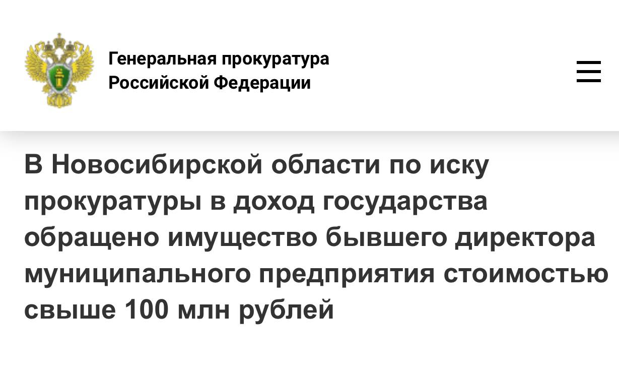В Новосибирской области по иску прокуратуры в доход государства обращено имущество бывшего директора муниципального предприятия стоимостью свыше 100 млн рублей