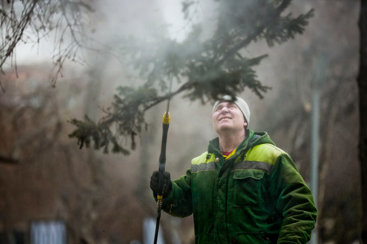 Чтобы достать до самых высоких ветвей, специалисты используют автовышку и поливочные машины. На помывку одного дерева требуется около 15 минут и 80 литров воды. Дождевание начинают с кроны, мыльный раствор легко смывает грязь, старую хвою и личинки вредителей со стволов. В городских условиях иголки страдают от загрязнений и живут в среднем в два раза меньше, чем в природе. Процедура помогает растению быстрее проснуться и начать фотосинтез.