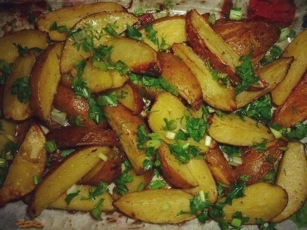 2. Разложите нарезанную картошку на противень, предварительно застелив его бумагой для выпечки. Немного посолите, но не слишком, так как соль добавляется позже. Поставьте в разогретую духовку и запекайте до готовности.