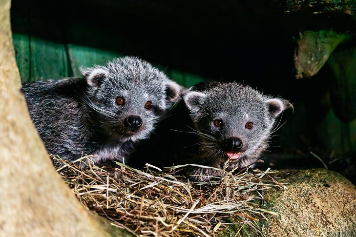 Тройня бинтуронгов впервые вышла на прогулку в Новосибирском зоопарке