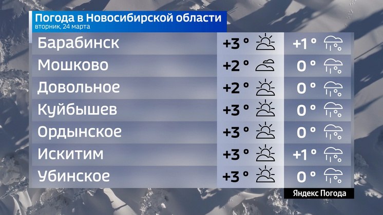 Так, по данным «Яндекс Погоды», во вторник, 24 марта, с утра в Новосибирске +1 градус и дождь со снегом. Днем малооблачно и +4 градуса. Северо-западный ветер будет дуть со скоростью 5,1 м/с. В среду, 25 марта, в городе от +1 до...