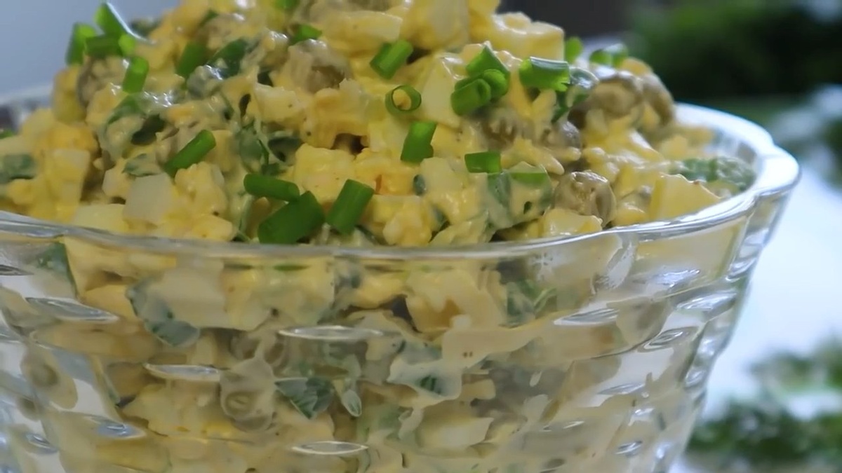Затем к получившейся смеси добавляется консервированный зелёный горошек и мелко нарезанный зелёный лук. Салат следует посолить и поперчить, а также добавить майонез.