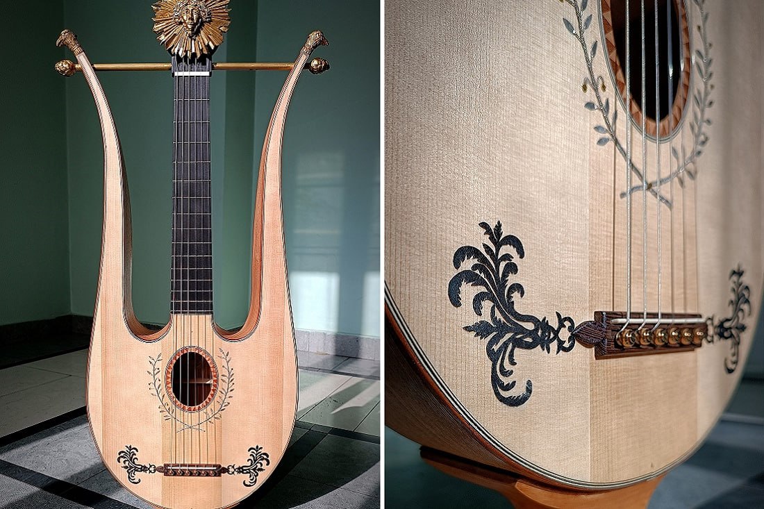 В XIX веке этот инструмент был популярен в салонах, ещё раньше на нём играла Мария-Антуанетта. Он сочетает лиру и гитару: внешне — лира, по устройству — гитара. Прежде такие изделия, как правило, изготавливали из ореха. Новосибирец использовал более доступную древесину ясеня. Кроме того, пришлось немного уменьшить размер лирогитары, чтобы с ней пропустили в самолёт.