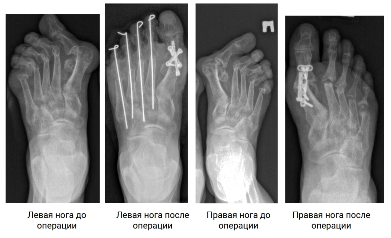 Операции проводили в два этапа: сначала на правой ноге (она болела сильнее), а через некоторое время — на левой. Врачи буквально «пересобрали» стопы, вернув пальцы в правильное положение.