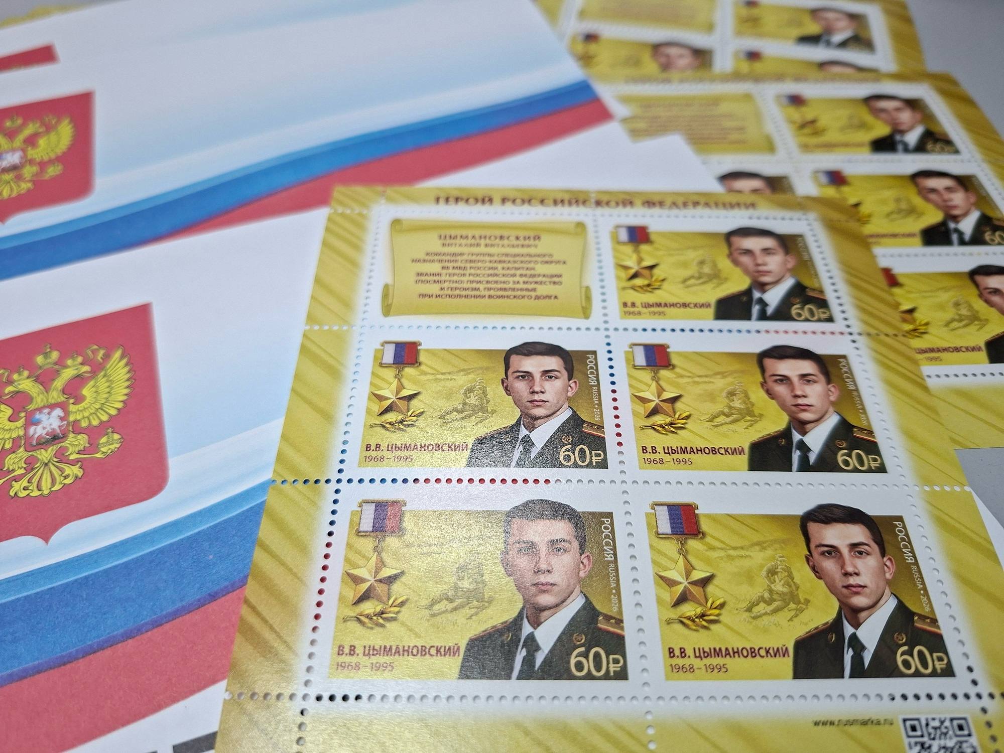 На марке изобразили портрет Виталия Цымановского и медаль «Золотая звезда». Капитан окончил Новосибирское высшее военное командное училище внутренних войск МВД, после чего его направили служить в Северо-Кавказский регион. Там он прошел путь от командира взвода до руководителя группы спецназначения.