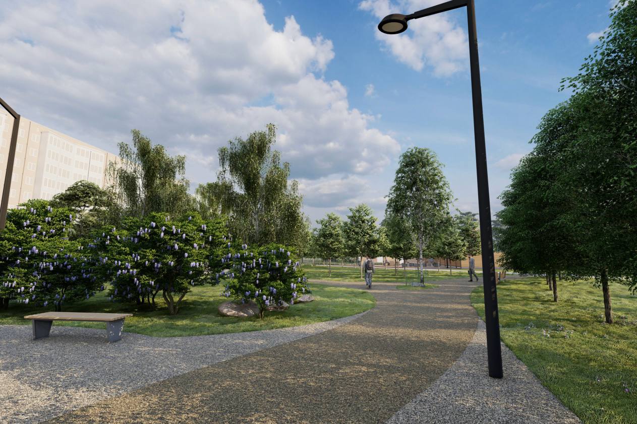 В этом году продолжаем благоустройство самого сквера — это второй этап работ. Делаем пешеходные дорожки, устанавливаем освещение и видеонаблюдение, обустраиваем площадки для спорта и детских игр, скейтпарк и памп-трек, зону выгула собак, общественный павильон. Параллельно усиливаем озеленение, создаём ливневые сады и приводим в порядок мемориал Александру Демакову.
