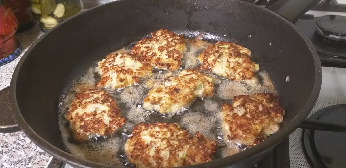 Пока карп остывает, можно обжарить лук и капусту, а затем измельчить их в блендере. Кабачки тоже можно либо нарезать, либо измельчить — это зависит от ваших предпочтений. Все ингредиенты смешиваются в одной миске, добавляются специи и мука, если фарш получается слишком жидким. На разогретую сковороду выкладываются котлеты, обжаривающиеся до золотистой корочки.