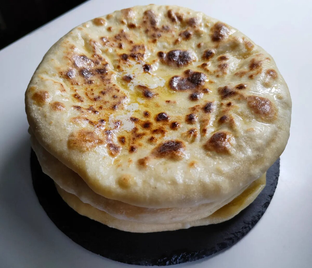 После достижения нужного результата перекладываем хачапури на блюдо и обильно смазываем сливочным маслом. Подавать лучше в стопке, как блины. Можно разрезать их на 2–4 части перед подачей.