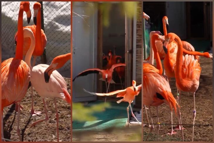Розовые фламинго вышли на первые весенние прогулки в Новосибирском зоопарке