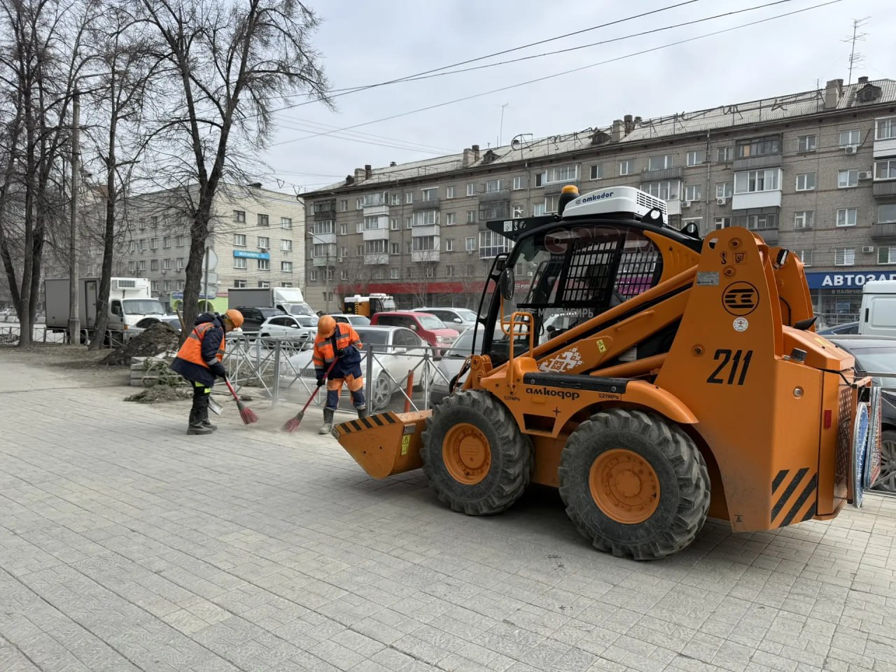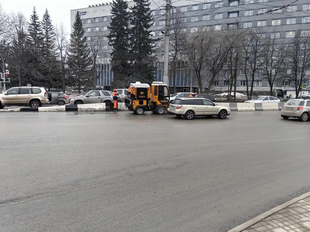 Погода позволяет дорожникам там, где уже высохла проезжая часть дороги и пешеходные зоны, выводить пылесосы и технику для уборки.