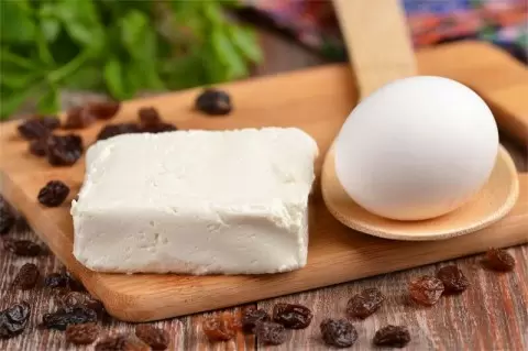 Смешайте в миске 100 г творога, 2 чайные ложки сахара, одну чайную ложку муки, куриное яйцо и столовую ложку изюма. Можно добавить другие сухофрукты или орехи по вкусу. Перемешайте и выложите смесь в глубокую тарелку с маленьким количеством воды, после чего поставьте в микроволновку на 3 минуты. Завтрак получится густым, сладким и ароматным.