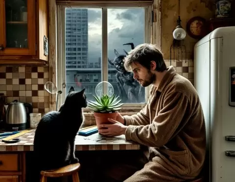 Находясь на кухне, она будто застыли в декорациях, а сама «ваша Эхеверия» напоминает статуэтку: никаких изменений, только один пожелтевший лист, который не сказать, чтобы был настоящим прогрессом. Возможно, основная проблема заключается в недостатке питания и пространства для корней, которые просто нуждаются в обновлении.