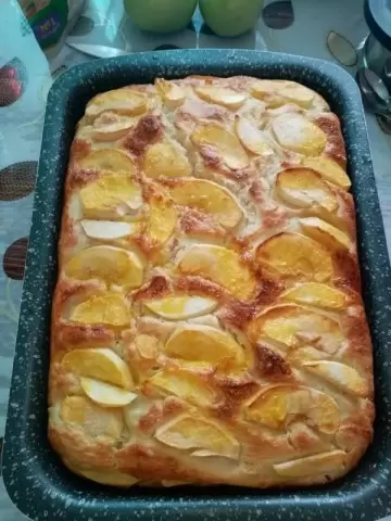 Далее следует смазать форму для выпекания растопленным маслом и аккуратно вылить в нее получившееся тесто. Яблоки очищают от кожуры, нарезают тонкими дольками и равномерно располагают сверху. Это придаст пирогу не только привлекательный вид, но и невероятный аромат.