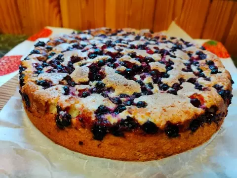 Теперь пришло время добавить смородину. Эта ягода обладает ярким вкусом, поэтому рекомендуется слегка присыпать ее сахаром — это поможет сбалансировать кислинку. Выпекайте пирог в течение 40 минут, пока он не зарумянится и не пропечется до готовности.