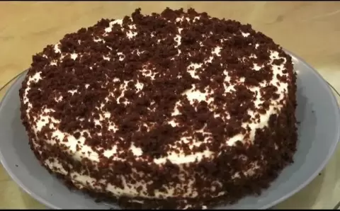 После выпекания дайте коржу остыть, а тем временем приготовьте крем, взбивая сметану с сахарной пудрой до однородности. Разрежьте остывший корж вдоль на две части, промажьте кремом обе половинки и соберите торт. Украсить можно крошкой от срезанного верхнего коржа. Дайте ему настояться в холодильнике минимум на час, чтобы вкусы объединились.