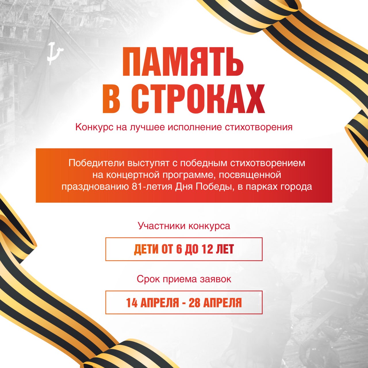 Конкурс посвящается 81-й годовщине Победы в Великой Отечественной войне. Участники – дети от 6 до 12 лет включительно.