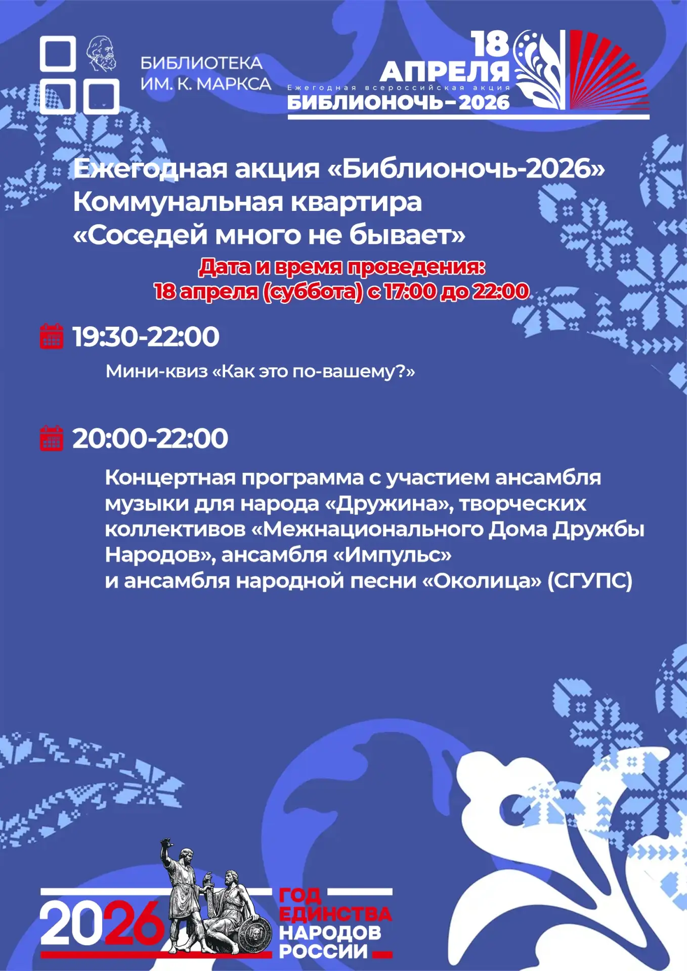 В этом году всероссийская акция объединяет участников вокруг темы «Единство народов – сила России!». Пространство библиотеки временно превратят в шумную коммунальную квартиру, где вместо соседей – книги, а вместо привычной тишины – живая музыка и смех. Девиз мероприятия: «Соседей много не бывает».
