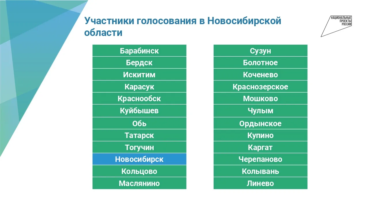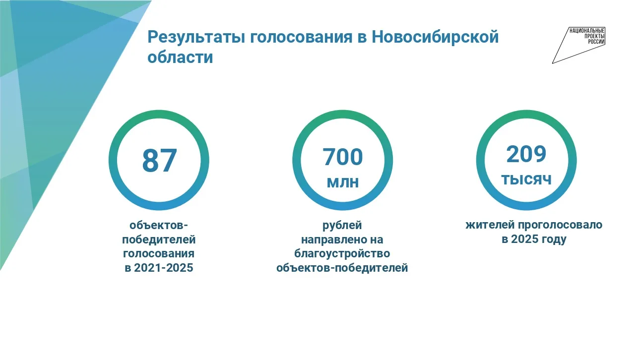В 2026 году для Всероссийского голосования по выбору объектов благоустройства в Новосибирской области предложен 81 объект в 24 городах и районных центрах Новосибирской области. В Новосибирске в этом году три общественные территории, набравшие наибольшее количество голосов, будут признаны победителями.