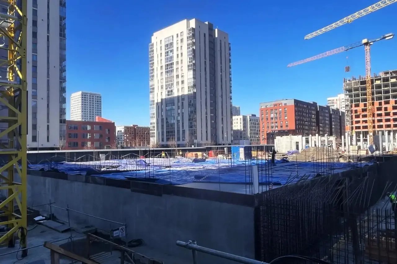 Сейчас активно ведётся возведение вертикальных конструкций в подвальной и бесподвальной частях здания, а также первого этажа. Завершают устройство монолитных лотков, предназначенных для будущих инженерных коммуникаций. Уложены плиты перекрытия.