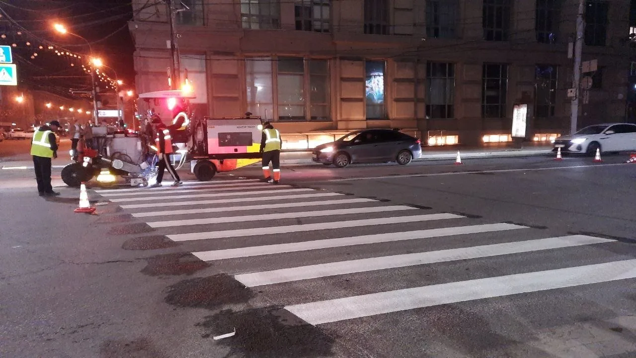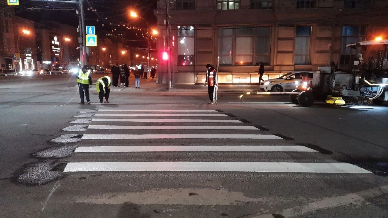 В пятницу ближе к полуночи и ночью проводились работы по нанесению дорожной разметки эмалью и горячим пластиком на площади им. Ленина. Также наносили разметку эмалью в Ленинском, Центральном, Заельцовском и Дзержинском районах. Помимо этого подрядчики ведут работы по восстановлению разметки на пешеходных переходах и безопасных школьных маршрутах.
