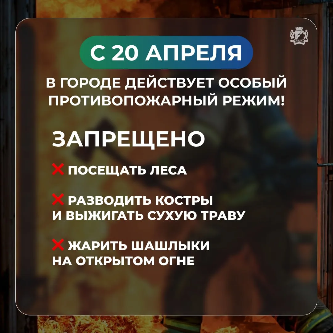 «С 20 апреля в городе действует особый противопожарный режим. В этот период запрещается посещать леса, разжигать костры, выжигать траву на землях лесного фонда и прилегающих территориях», – напомнили в управлении по делам гражданской обороны, чрезвычайным ситуациям и обеспечению пожарной безопасности.