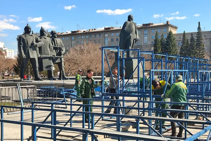 Подготовка трибуны в центре Новосибирска идет полным ходом. Фото Андрея Заржецкого, VN.ru.