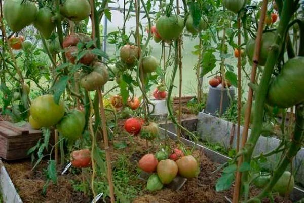 - Крупные, плоские и слегка ребристые помидоры, которые при достижении зрелости обретают розоватый цвет.
