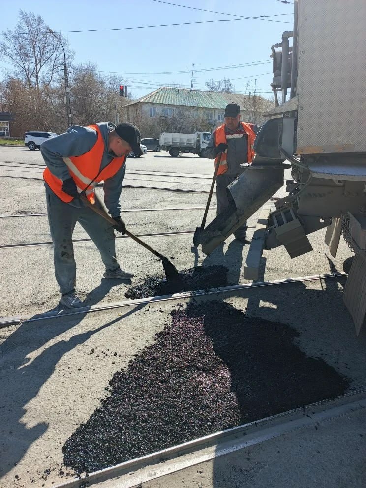 Сегодня на перекрестке улиц Кошурникова и Никитина, где проходят трамвайные пути, отремонтировали дорожное покрытие с использованием литого асфальтобетона. Он хорошо себя зарекомендовал как в зимних условиях, так и летом. Перевозят асфальтобетон в специальной установке называемой кохер или термос-бункер. С использованием такого материала устраняли повреждения проезжей части в местах пересечения автодороги и трамвайных путей.